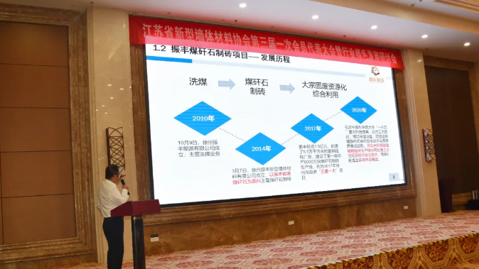 大會(huì)第二階段就進(jìn)一步推進(jìn)行業(yè)綠色發(fā)展進(jìn)行了交流,徐州振豐新型墻體材料有限公司技術(shù)總監(jiān)崔皓介紹了徐州振豐公司煤矸石制磚項(xiàng)目在產(chǎn)業(yè)升級(jí)及循環(huán)經(jīng)濟(jì)產(chǎn)業(yè)鏈延伸探索方面的經(jīng)驗(yàn),該公司年產(chǎn)7.2億塊煤矸石隧道窯燒結(jié)磚協(xié)同處置項(xiàng)目被列入徐州市“無廢城市”試點(diǎn)示范項(xiàng)目;新華盛節(jié)能科技有限公司副總經(jīng)理陳志明以“企業(yè)綠色轉(zhuǎn)型發(fā)展介紹”為題,介紹了該公司的基本情況及研發(fā)的新產(chǎn)品免燒自保溫多孔砌塊;南通恒達(dá)機(jī)械制造有限公司總工程師于銀龍以“創(chuàng)新發(fā)展,恒達(dá)永遠(yuǎn)在路上”為題,介紹了南通恒達(dá)移動(dòng)式隧道窯、打包機(jī)和碼垛機(jī)等產(chǎn)品的技術(shù)優(yōu)點(diǎn)以及客戶案例。三位嘉賓的報(bào)告贏得了與會(huì)代表們的熱烈掌聲。